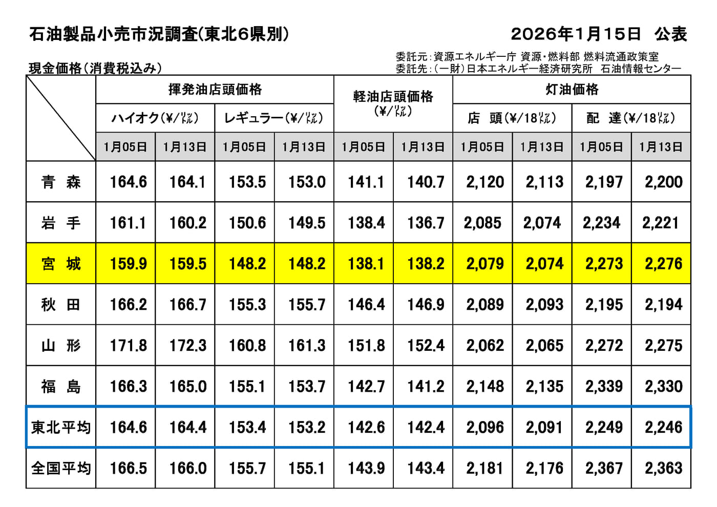 2026年1月15日公表 石油製品小売市況調査(東北6県)揮発油・軽油・灯油