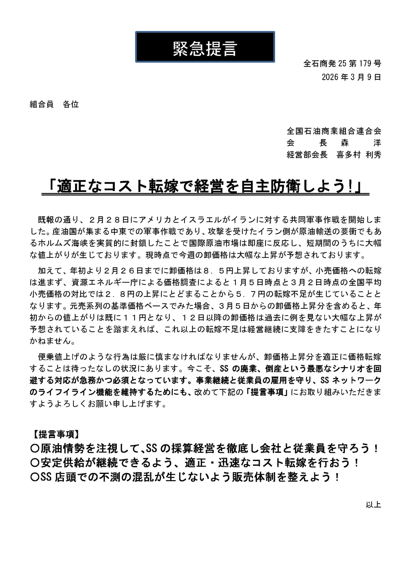 【緊急要請】「適正なコスト転嫁で経営を自主防衛しよう!」
