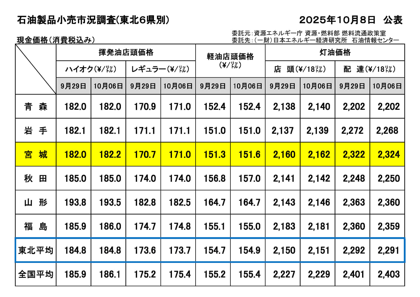 【資エネ庁】2025年10月8日公表 石油製品小売市況調査(東北6県)について