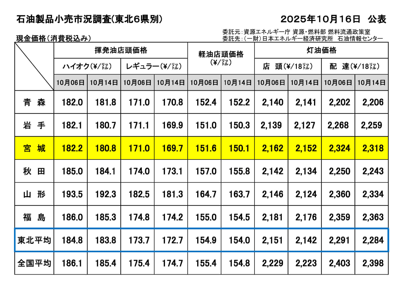 【資エネ庁】2025年10月16日公表 石油製品小売市況調査(東北6県)について