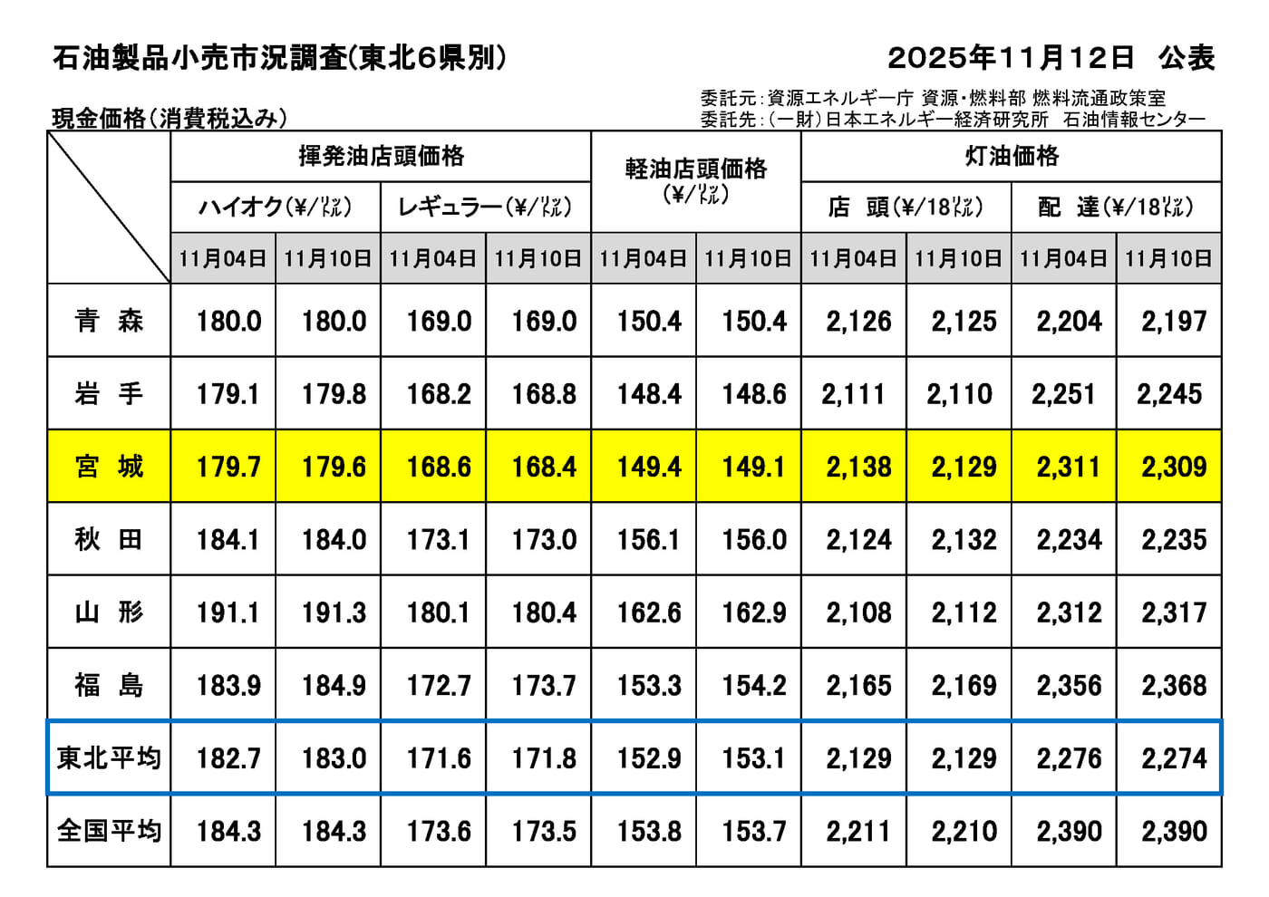 【資エネ庁】2025年11月12日公表 石油製品小売市況調査(東北6県)について