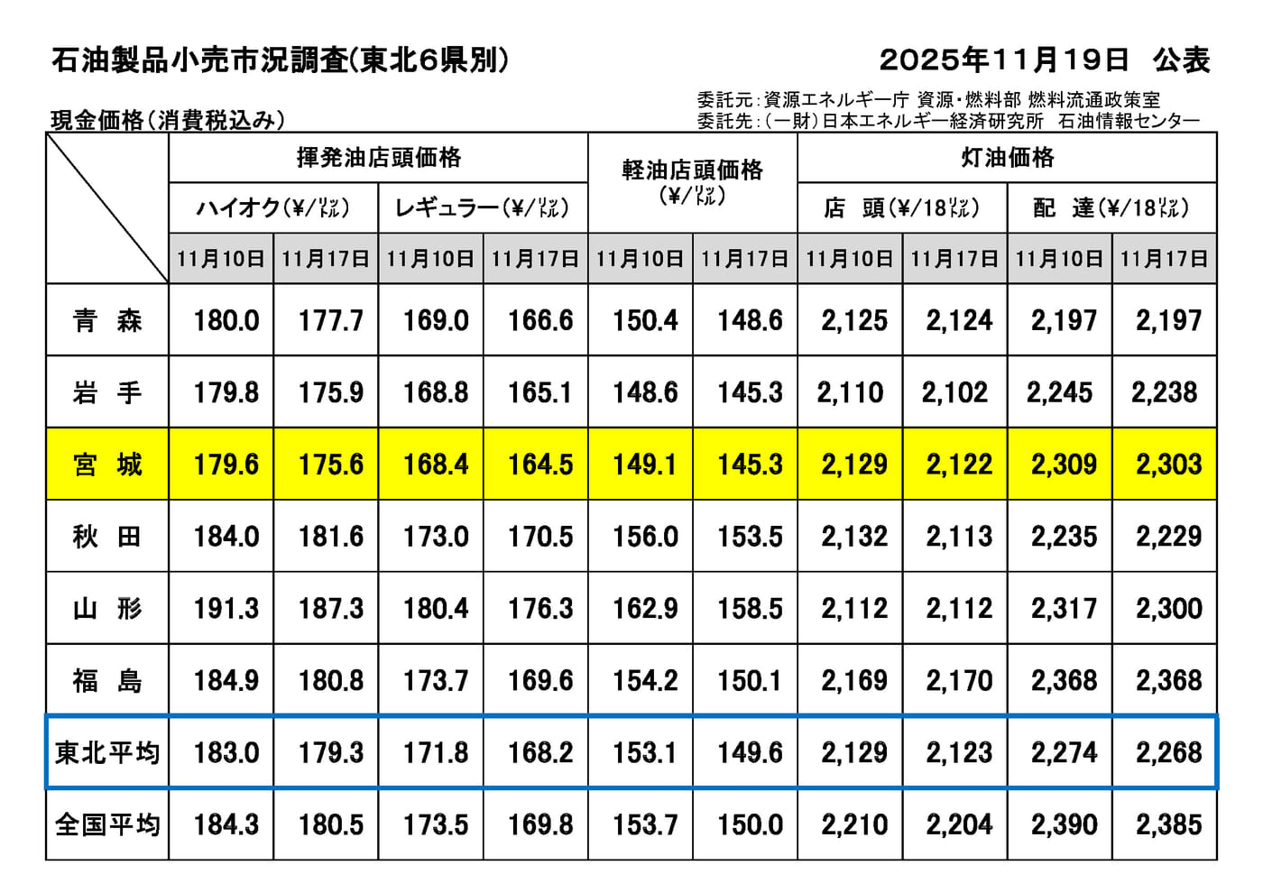 【資エネ庁】2025年11月19日公表 石油製品小売市況調査(東北6県)について