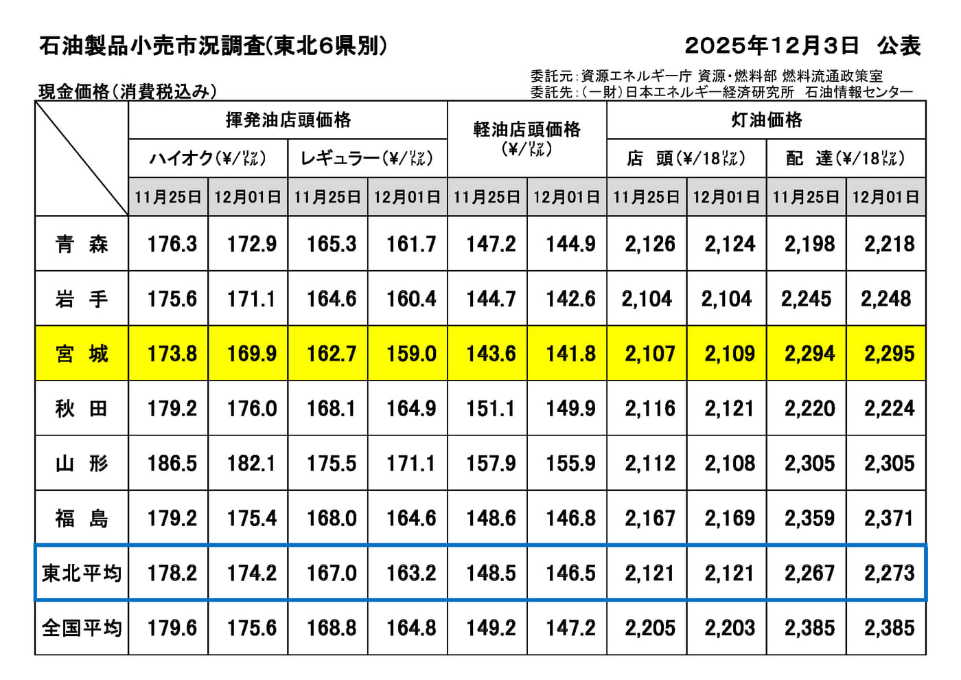 【資エネ庁】2025年12月3日公表 石油製品小売市況調査(東北6県)について