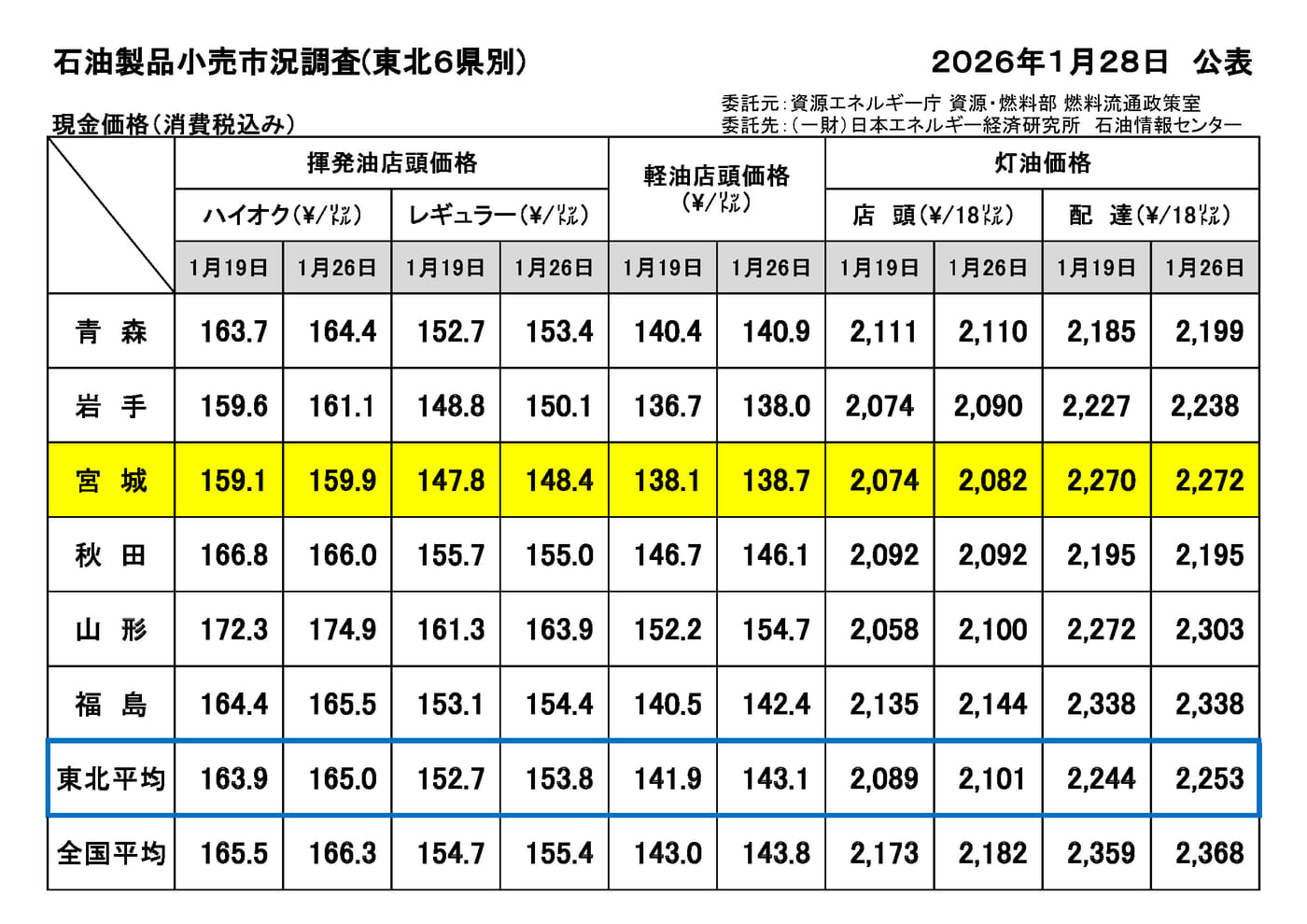 【資エネ庁】2026年1月28日公表 石油製品小売市況調査(東北6県)について