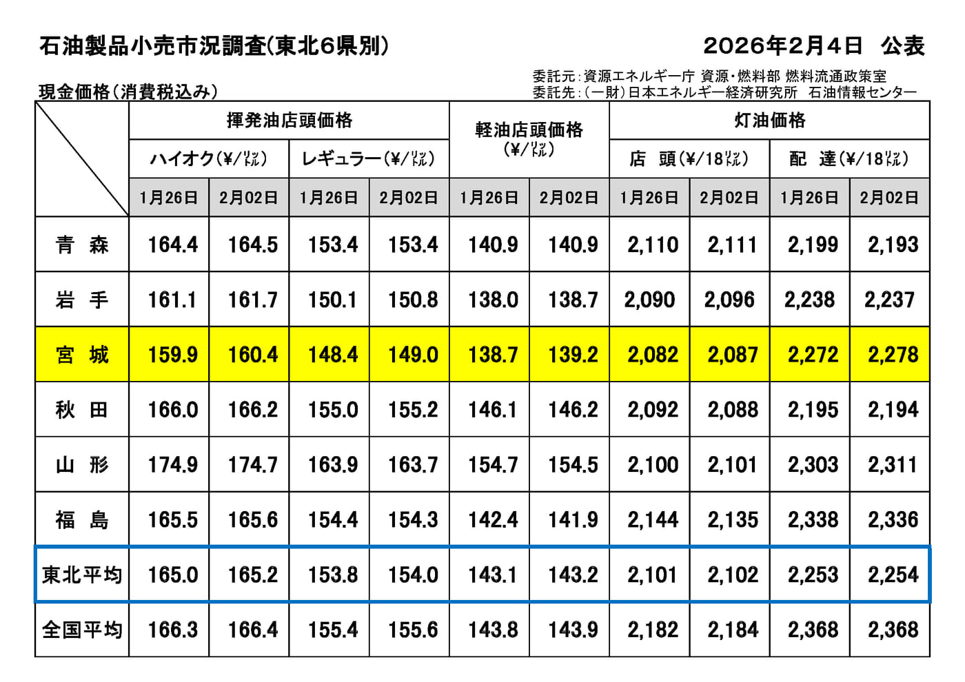 【資エネ庁】2026年2月4日公表 石油製品小売市況調査(東北6県)について は