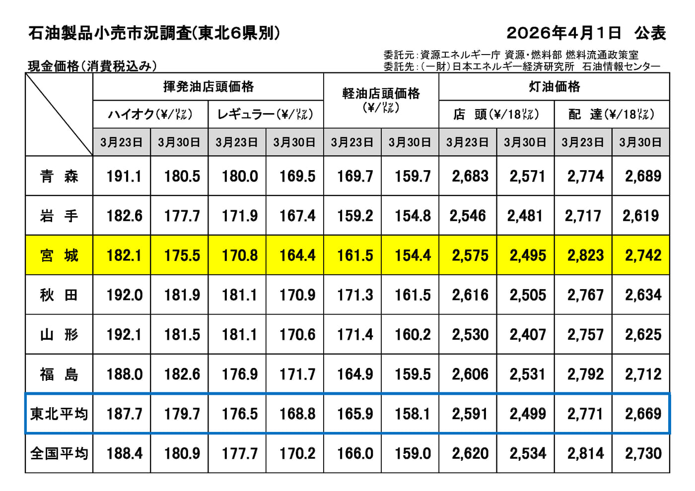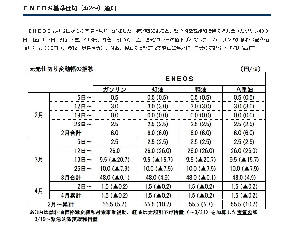 👇クリックすると、PDFファイルが開きます。 2026年4月1日公表 石油製品小売市況調査(東北6県)揮発油・軽油・灯油 👇クリックすると、PDFファイルが開きます。 2026年4月1日通知 ENEOS基準仕切り(4/2~)