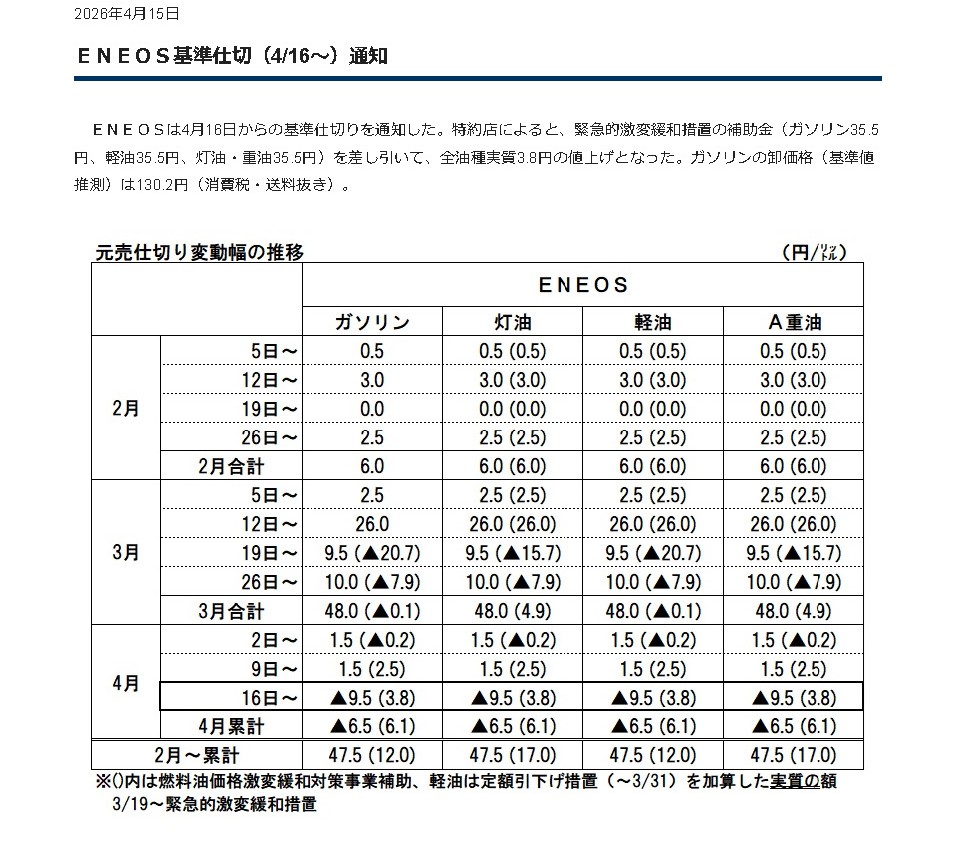 2026年4月15日通知 ENEOS基準仕切り(4/16~)