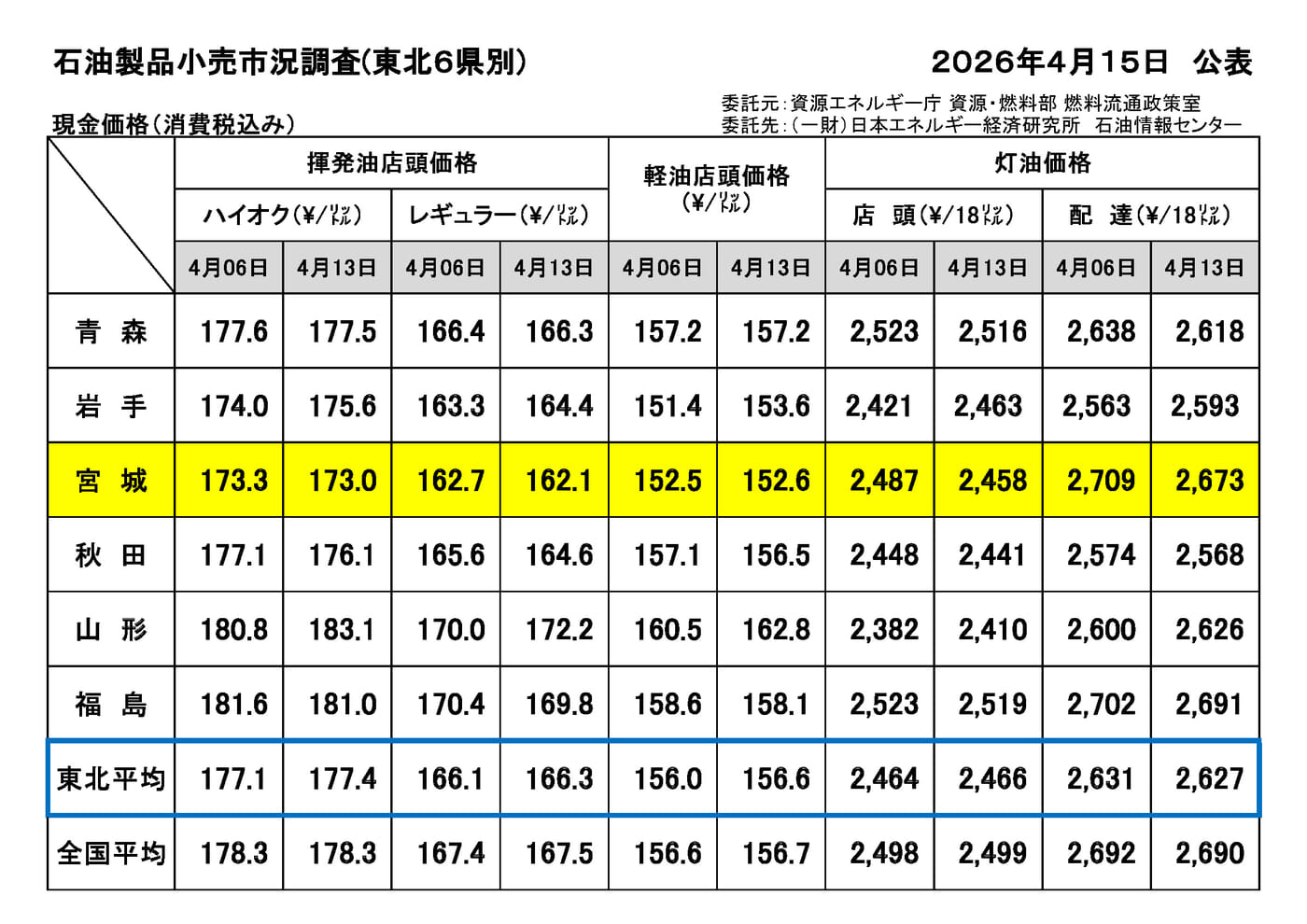 2026年4月15日公表 石油製品小売市況調査(東北6県)揮発油・軽油・灯油